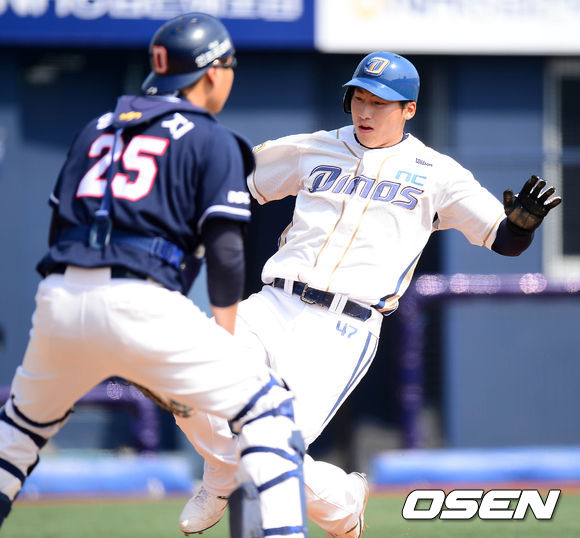 18일 오후 창원 마산야구장에서 열린 '2014 한국야쿠르트 세븐 프로야구' 시범경기 NC 다이노스와 두산 베어스의 경기, 2회말 무사 1루에서 NC 모창민의 좌전 적시타 때 1루주자 나성범이 홈으로 쇄도하고 있다.