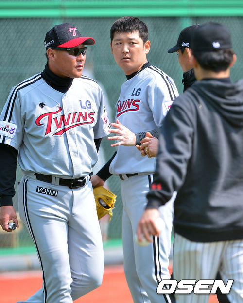 18일 오전 경남 김해시 상동구장에서 열린 '2014 프로야구 시범경기' 롯데 자이언츠와 LG 트윈스의 경기, 3회말 롯데 공격 후 LG 선발투수 김선우가 구심에게 스트라이크 판정에 항의하고 있다.