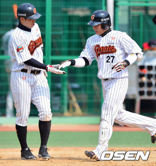 18일 오전 경남 김해시 상동구장에서 열린 '2014 프로야구 시범경기' 롯데 자이언츠와 LG 트윈스의 경기,4회말 1사 2루 롯데 용덕한이 2점 홈런을 날린후 2루 주자 전준우의 축하를 받고 있다.