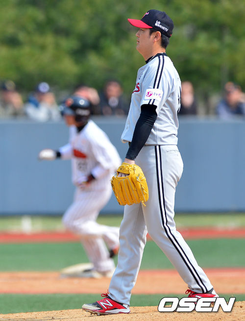 18일 오전 경남 김해시 상동구장에서 열린 '2014 프로야구 시범경기' 롯데 자이언츠와 LG 트윈스의 경기,4회말 1사 2루 롯데 용덕한에게 2점 홈런을 허용한 LG 선발투수 김선우가 아쉬워하고 있다