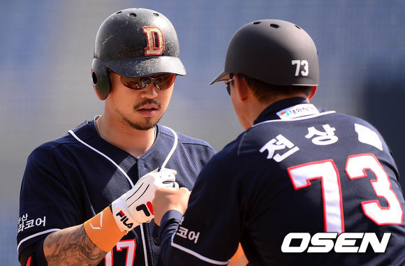 18일 오후 창원 마산야구장에서 열린 '2014 한국야쿠르트 세븐 프로야구' 시범경기 NC 다이노스와 두산 베어스의 경기, 3회초 2사 2,3루에서 두산 오재원이 중전 2타점 적시타를 치고 전상렬 코치와 하이파이브를 하고 있다.