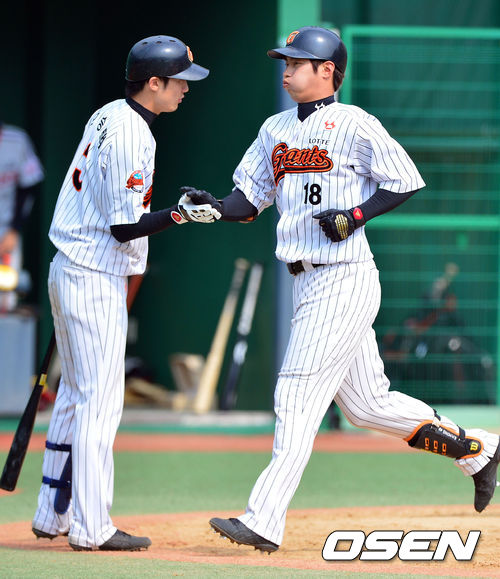 18일 오전 경남 김해시 상동구장에서 열린 '2014 프로야구 시범경기' 롯데 자이언츠와 LG 트윈스의 경기,5회말 롯데 선두타자 김대우가 솔로홈런을 날리고 홈을 밟고 있다.