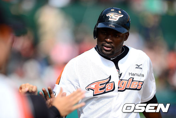 4회말 2사 2루에서 한화 피에가 김태완의 역전 적시타에 홈을 밟고 더그아웃에서 동료선수들과 하이파이브를 하고 있다.