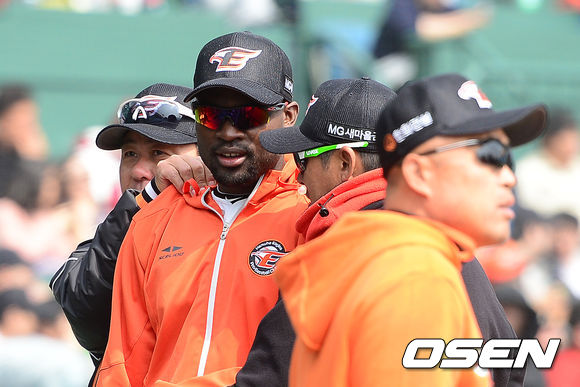 경기에 앞서 한화 피에가 김성한, 이종범 코치와 이야기를 나누고 있다.