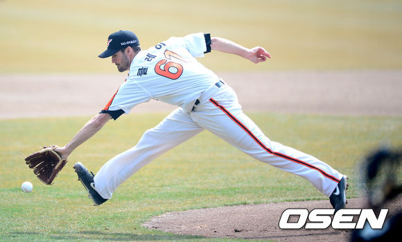 1회초 2사에서 한화 클레이가 넥센 로티노의 투수앞 땅볼 타구를 처리하고 있다.