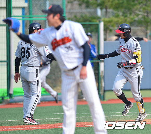 18일 오전 경남 김해시 상동구장에서 열린 '2014 프로야구 시범경기' 롯데 자이언츠와 LG 트윈스의 경기,7회초 2사 1,3루 LG 정성훈이 3점 홈런을 날리고 베이스를 돌고 있다.
