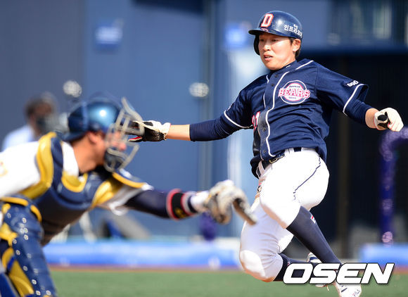 18일 오후 창원 마산야구장에서 열린 '2014 한국야쿠르트 세븐 프로야구' 시범경기 NC 다이노스와 두산 베어스의 경기, 5회초 2사 1,2루에서 두산 홍성흔의 내야안타 때 NC 2루수 박민우의 실책을 틈 타 홈으로 쇄도한 2루주자 정수빈이 홈에서 세이프 되고 있다.