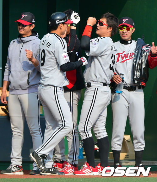 18일 오전 경남 김해시 상동구장에서 열린 '2014 프로야구 시범경기' 롯데 자이언츠와 LG 트윈스의 경기,9회초 무사 1루 LG 문선재가 2점 홈런을 날리고 동료들의 축하를 받고 있다