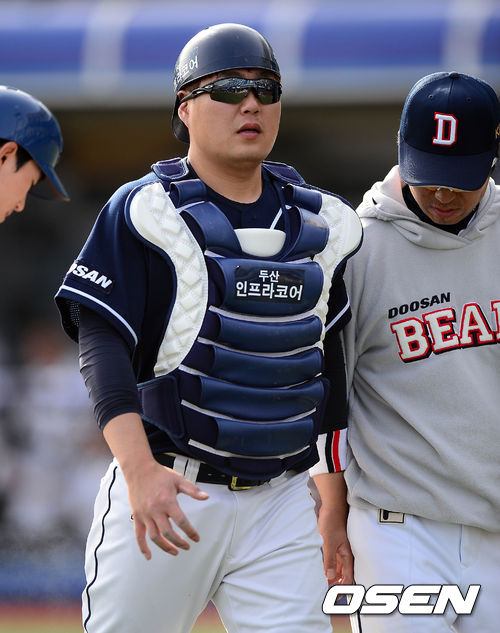18일 오후 창원 마산야구장에서 열린 '2014 한국야쿠르트 세븐 프로야구' 시범경기 NC 다이노스와 두산 베어스의 경기, 6회말 두산 오현택의 투구에 맞은 포수 양의지가 교체되고 있다.