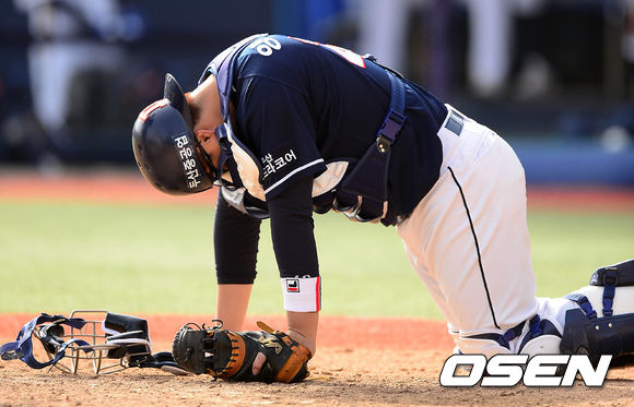 18일 오후 창원 마산야구장에서 열린 '2014 한국야쿠르트 세븐 프로야구' 시범경기 NC 다이노스와 두산 베어스의 경기, 6회말 두산 오현택의 투구에 맞은 포수 양의지가 고통스러워하고 있다.