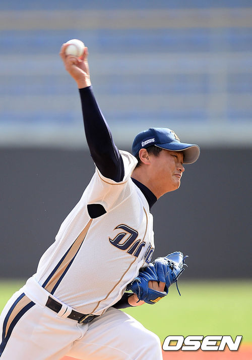 18일 오후 창원 마산야구장에서 열린 '2014 한국야쿠르트 세븐 프로야구' 시범경기 NC 다이노스와 두산 베어스의 경기, 7회초 NC 박명환이 힘차게 공을 던지고 있다.