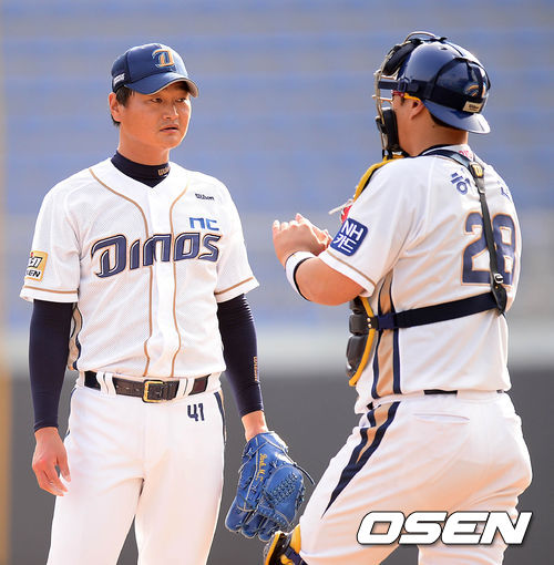 18일 오후 창원 마산야구장에서 열린 '2014 한국야쿠르트 세븐 프로야구' 시범경기 NC 다이노스와 두산 베어스의 경기, 7회초 무사 만루에서 마운드를 방문한 NC 포수 허준이 박명환과 이야기를 나누고 있다.