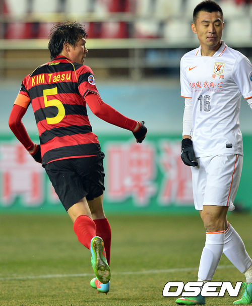 18일 오후 경북 포항시 포항스틸야드서 열린 2014 아시아축구연맹(AFC) 챔피언스리그 E조 조별리그 3차전 포항 스틸러스와 산둥 루넝(중국)의 경기, 전반 포항 김태수가 골을 넣고 있다.