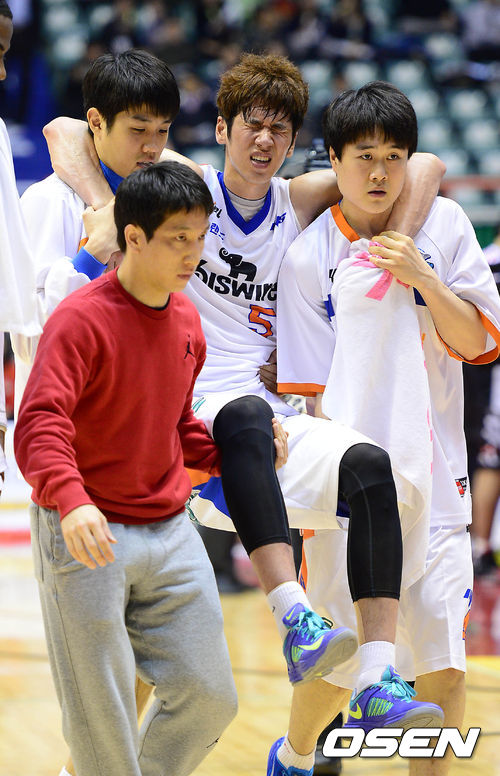 3쿼터 부상을 당한 전자랜드 김상규가 실려 나가고 있다.