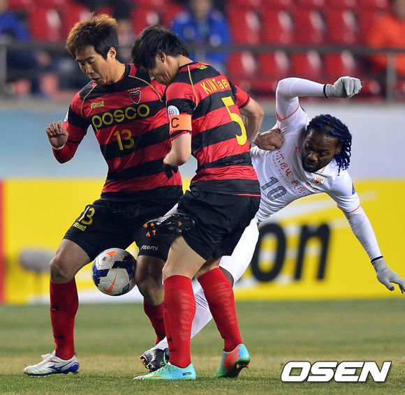18일 오후 경북 포항시 포항스틸야드서 열린 2014 아시아축구연맹(AFC) 챔피언스리그 E조 조별리그 3차전 포항 스틸러스와 산둥 루넝(중국)의 경기, 후반 포항 김원일과 김태수가 루넝 바그너 러브를 수비하고 있다.