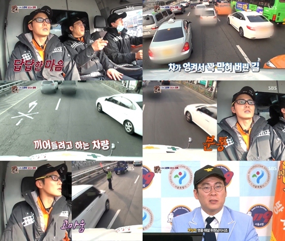 18일 오후 방송된 SBS 예능프로그램 '심장이 뛴다'에서는 조동혁과 장동혁이 응급 환자를 이송하면서 꽉 막힌 도로 때문에 답답해하는 모습이 그려졌다.