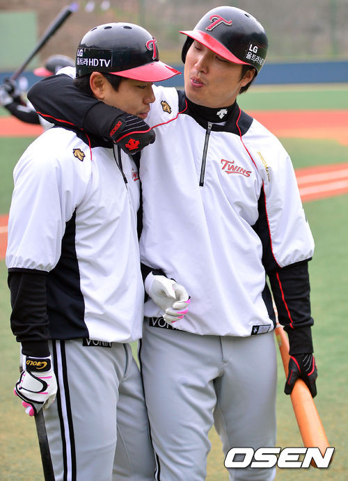 19일 경남 김해시 상동구장에서 열리는 '2014 프로야구 시범경기' 롯데 자이언츠와 LG 트윈스의 경기에 앞서 LG 이진영이 백창수에게 장난을 걸고 있다. .