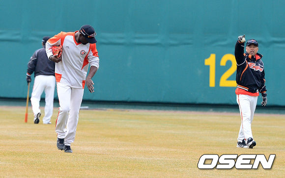 경기에 앞서 한화 피에가 외야에서 캐치볼을 하던 중 날아 온 타구에 왼쪽 손을 맞고 부상 상태를 살피기 위해 더그아웃으로 향하고 있다. 피에는 단순 타박상으로 이날 경기에 출전한다.