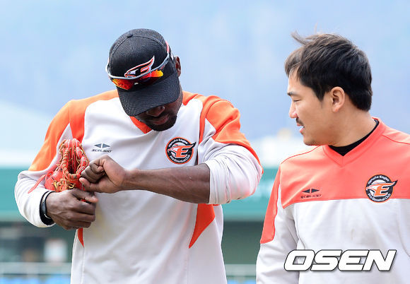 경기에 앞서 한화 피에가 외야에서 캐치볼을 하던 중 날아 온 타구에 왼쪽 손을 맞고 부상 상태를 살피기 위해 더그아웃으로 향하고 있다. 피에는 단순 타박상으로 이날 경기에 출전한다.