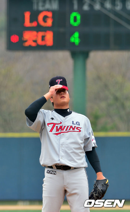 19일 경남 김해시 상동구장에서 열린 '2014 프로야구 시범경기' 롯데 자이언츠와 LG 트윈스의 경기, 1회말 4실점 허용한 LG 선발투수 류제국이 아쉬워하고 있다.