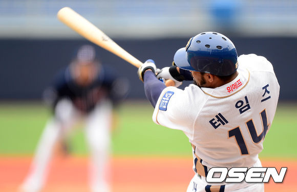 1회말 1사 1,3루에서 NC 테임즈가 좌중간을 가르는 2타점 적시타를 치고 있다.