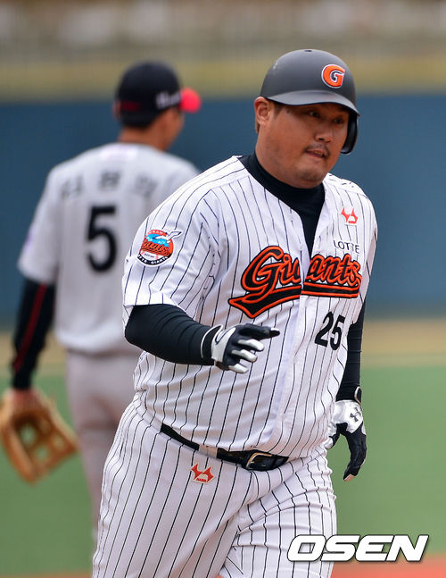 19일 경남 김해시 상동구장에서 열린 '2014 프로야구 시범경기' 롯데 자이언츠와 LG 트윈스의 경기,1회말 무사 2,3루 롯데 최준석이 3점 홈런을 날린후 베이스를 돌고 있다.