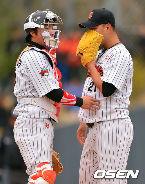 19일 경남 김해시 상동구장에서 열린 '2014 프로야구 시범경기' 롯데 자이언츠와 LG 트윈스의 경기, 4회초 1사 롯데 송승준 선발투수가 LG 정의윤과 최승준에게 연속타자 홈런을 허용한 후 용덕한 포수와 마운드에서 이야기를 나누고 있다