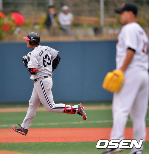 19일 경남 김해시 상동구장에서 열린 '2014 프로야구 시범경기' 롯데 자이언츠와 LG 트윈스의 경기, 4회초 1사 LG 최승준이 정의윤에 이어 연속타자 홈런을 날리고 베이스를 돌고 있다
