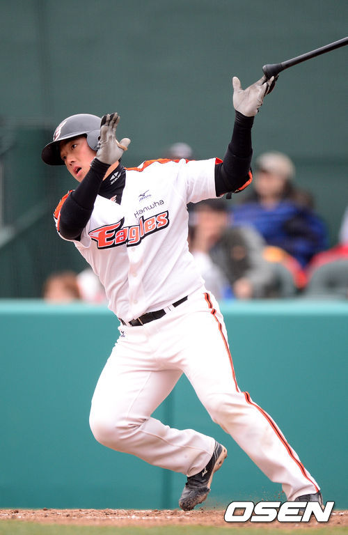 5회말 1사 2루에서 한화 김민수가 좌전안타를 날리고 있다.
