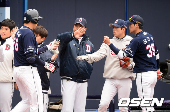 19일 오후 창원 마산야구장에서 열린 '2014 한국야쿠르트 세븐 프로야구' 시범경기 NC 다이노스와 두산 베어스의 경기, 4회초 1사 1루에서 두산 오재일이 중월 투런 홈런을 치고 더그아웃에서 동료들과 하이파이브를 하고 있다.