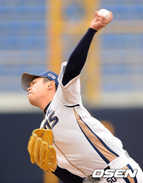 19일 오후 창원 마산야구장에서 열린 '2014 한국야쿠르트 세븐 프로야구' 시범경기 NC 다이노스와 두산 베어스의 경기, 5회초 무사에서 NC 손정욱이 힘차게 공을 던지고 있다.