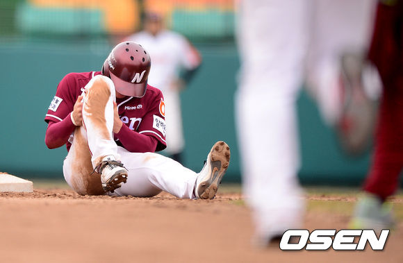 7회초 1사 1루에서 넥센 임병욱이 2루 도루에 성공했지만 발목이 베이스에 걸려 부상을 당하며 괴로워고 있다.