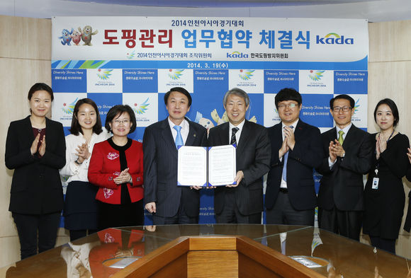 2014인천아시아경기대회 조직위원회(위원장 김영수)는 대회의 성공적 개최를 위해 19일 송도 미추홀타워 조직위 회의실에서 한국도핑방지위원회(KADA)와 상호 업무협약을 체결했다.