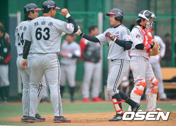 19일 경남 김해시 상동구장에서 열린 '2014 프로야구 시범경기' 롯데 자이언츠와 LG 트윈스의 경기, 7회초 2사 1,3루 LG 백창수가 3점 홈런을 날린후 동료들의 축하를 받고 있다.