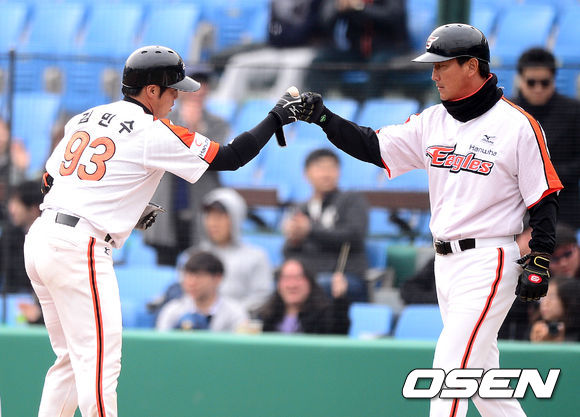 7회말 무사 1,2루에서 한화 김민수가 1타점 적시타를 날리고 강석천 코치와 주먹을 맞대고 있다.