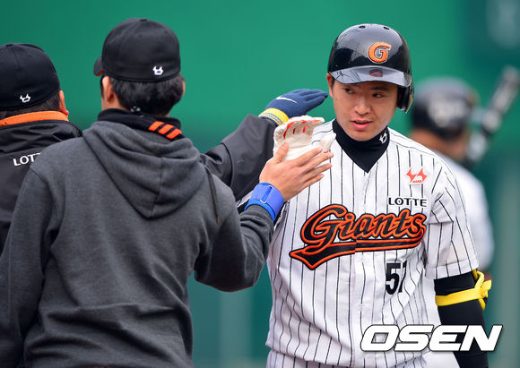 19일 경남 김해시 상동구장에서 열린 '2014 프로야구 시범경기' 롯데 자이언츠와 LG 트윈스의 경기, 8회말 2사 롯데 신원재가 동점 1점 홈런을 날린후 동료들의 축하를 받고 있다.