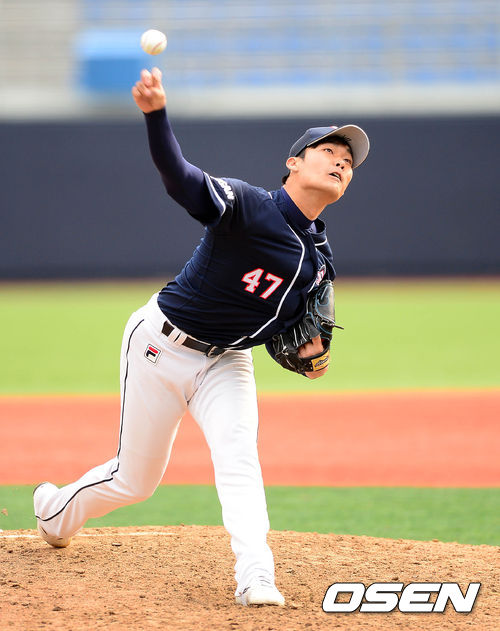 19일 오후 창원 마산야구장에서 열린 '2014 한국야쿠르트 세븐 프로야구' 시범경기 NC 다이노스와 두산 베어스의 경기, 7회말 두산 홍상삼이 힘차게 공을 던지고 있다.