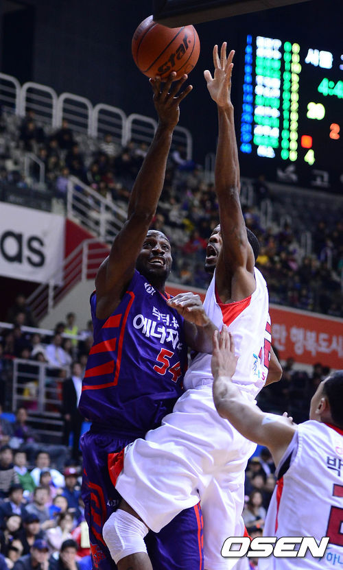 19일 오후 고양시 고양체육관에서 열린 '2013-2014 KB국민카드 프로농구' 6강 플레이오프 4차전 고양 오리온스와 서울 SK의 경기 2쿼터 리처드슨이 헤인즈를 앞에두고 슛을 시도하고 있다.