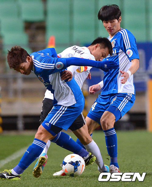 19일 경남 울산시 울산문수경기장에서 열린 2014 아시아축구연맹(AFC) 챔피언스리그(이하 ACL) H조 조별리그 3차전 울산 현대와 구이저우 런허(중국)의 경기, 전반 울산 이용과 강민수가 협공 수비를 펼치며 공을 빼앗고 있다