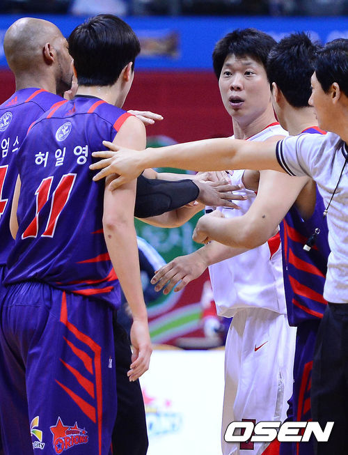 19일 오후 고양시 고양체육관에서 열린 '2013-2014 KB국민카드 프로농구' 6강 플레이오프 4차전 고양 오리온스와 서울 SK의 경기 3쿼터 박상오와 허일영이 말다툼을 하고 있다.