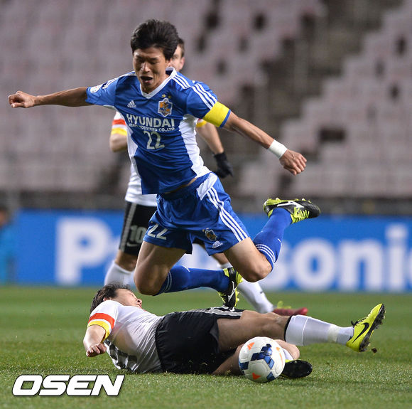 19일 경남 울산시 울산문수경기장에서 열린 2014 아시아축구연맹(AFC) 챔피언스리그(이하 ACL) H조 조별리그 3차전 울산 현대와 구이저우 런허(중국)의 경기, 후반 울산 김치곤이 구이저우 선수의 위험한 태클에 걸려 넘어지고 있다.