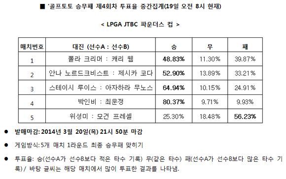 LPGA JTBC 파운더스 컵 대상 골프토토 승무패 4회차 투표율 중간집계 결과
