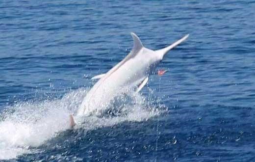 최근 코스타리카에서 온몸이 하얀 새치류가 낚이면서 촬영된 여러 사진이 공개됐다. 낚시계는 물론 네티즌 사이에서도 주목받고 있는 이 온몸이 하얀 청새치는 미국의 베테랑 바다낚시꾼 카렌 위버가 코스타리카 로스 수에뇨스에서 20마일(약 32km) 떨어진 바다에서 낚은 것으로 알려졌다.