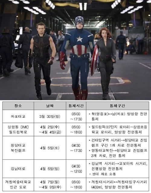 문화체육관광부(이하 문체부)는 지난 18일 ‘어벤져스: 에이지 오브 울트론’(이하 어벤져스2) 촬영 일정과 장소, 교통 통제계획을 발표했다.