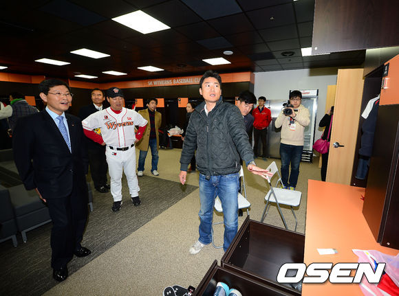 20일 오후 인천 문학구장에서 '2014 프로야구' 시범경기 SK 와이번스와 LG 트윈스의 경기가 열릴 예정인 가운데 SK 와이번스 클럽하우스에서 이만수 감독, 임원일 사장, 민경삼 단장이 선수들의 락커룸을 살피고 있다.