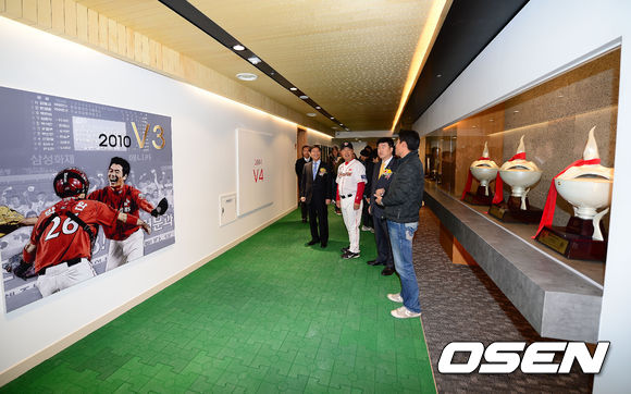 20일 오후 인천 문학구장에서 '2014 프로야구' 시범경기 SK 와이번스와 LG 트윈스의 경기가 열릴 예정인 가운데 SK 와이번스 클럽하우스에서 이만수 감독, 임원일 사장, 민경삼 단장이 클럽하우스 투어를 하고 있다.