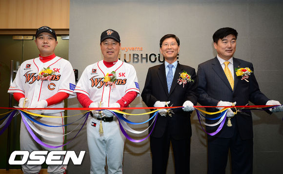 20일 오후 인천 문학구장에서 '2014 프로야구' 시범경기 SK 와이번스와 LG 트윈스의 경기가 열릴 예정인 가운데 SK 와이번스 클럽하우스에서 주장 박진만, 이만수 감독, 임원일 사장, 민경삼 단장이 테이프 커팅식을 진행하고 있다.