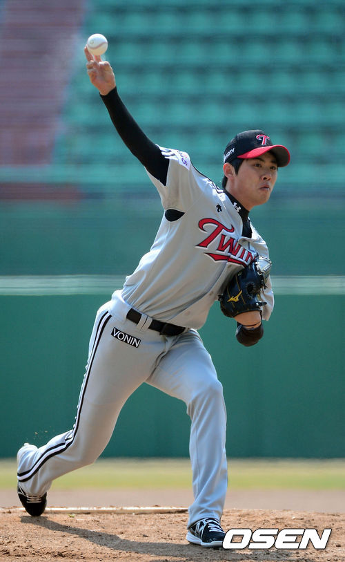 20일 오후 인천 문학구장에서 '2014 프로야구' 시범경기 SK 와이번스와 LG 트윈스의 경기가 열렸다. LG 선발 임정우가 힘차게 공을 뿌리고 있다.