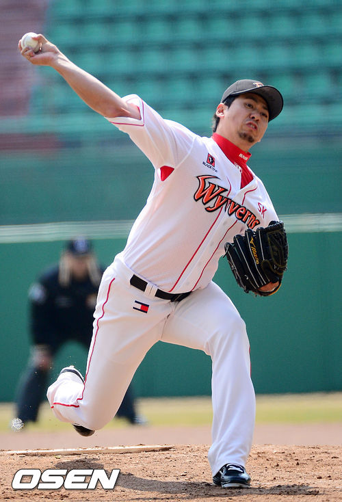 20일 오후 인천 문학구장에서 '2014 프로야구' 시범경기 SK 와이번스와 LG 트윈스의 경기가 열렸다. SK 선발 윤희상이 힘차게 공을 뿌리고 있다.