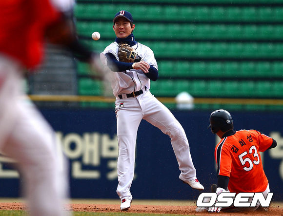 20일 오후 서울 잠실구장에서 열린 '2014 프로야구 시범경기' 두산 베어스와 한화 이글스의 경기 2회초 1사 1루 한상훈의 땅볼을 고영민이 2루에서 김회성을 포스아웃 시킨 후 1루로 송구하고 있다.
